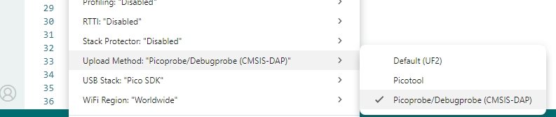 Having wired up the Pi Pico DebugProbe, plug in its USB connection (leave the target's USB un-connected) and in Arduino IDE, and under Tools select Picoprobe/Debugprobe (CMSIS-DAP) for the Upload Method
