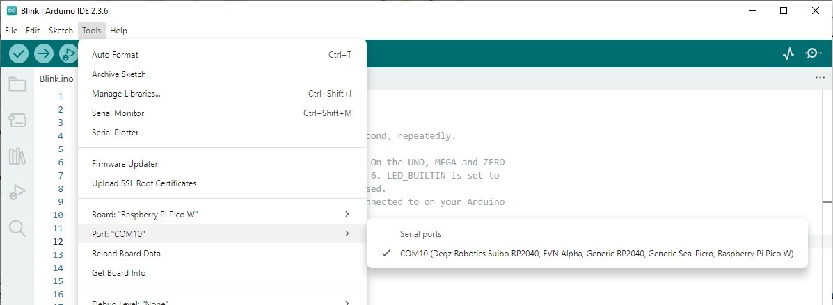 Opening Arduino IDE V2 should show the same COM port for the Pi Pico.