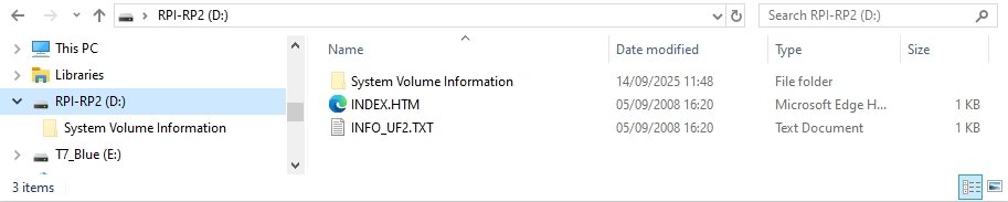 Drag and drop (or copy/paste) the debugpobe_on_pico.uf2 to that folder to upload the debug probe support. The folder will close.