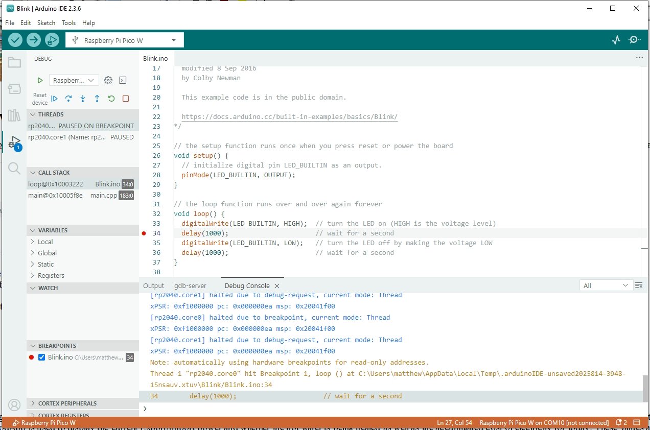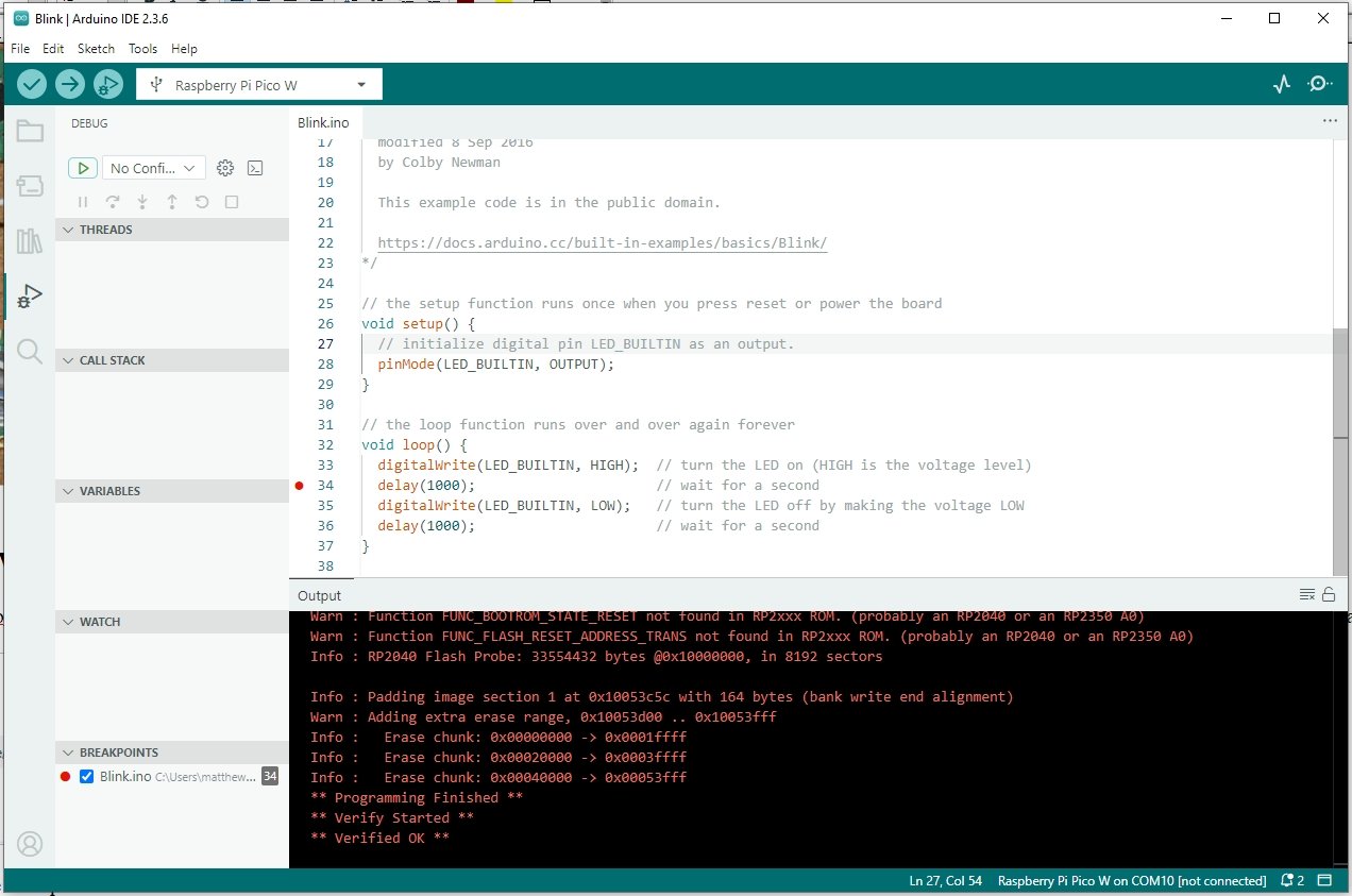 This tutorial covered installing, setting up, wiring up and debugging Pi Pico target boards from Arduino IDE V2. It also showed how to redirect the serial output to Serial1 when debugging via the Pi Pico debug probe.