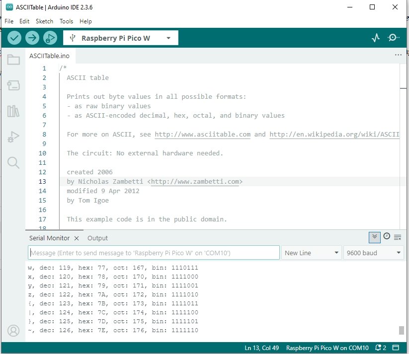 The ASCIITable sketch outputs the table to the USB Serial connection. However while you are debugging, just plugging the target's USB into the computer will not give you the Serial output. You need to re-direct the Serial output to Serial1, pins GPIO0 (TX) GPIO1 (RX) and wire those pins on the target to the Pi Pico DebugProbe pins GPIO6 → RX and GPIO7 → TX