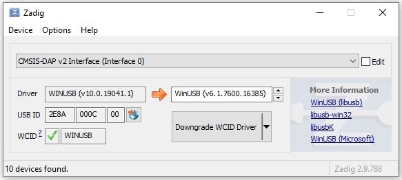 You can check the driver installation by opening Zadig V2.9 and choosing Options → All Devices will show CMSIS-DAP V2 in the drop down list.