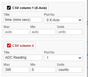 Each CSV column has its own block. The CSV column label and tick box are shown in the same colour as the plot line for that field, making it easy to identify which field maps to which line.