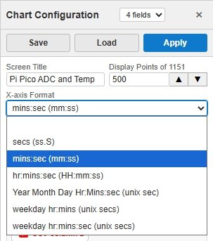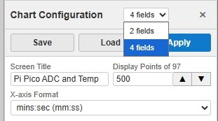Chart Configuration lets you customise how the chart looks — field titles, which subplot each field appears on, Y-axis limits, and the X-axis time format. Changes are applied by clicking Apply, and configurations can be saved and loaded as files.