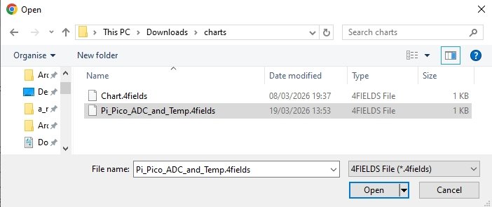 Configurations are saved as plain-text pfod plot command files with a .Nfields extension (e.g. MyChart.4fields for a 4-field dataset). This lets the file picker automatically filter to show only files compatible with the current data.