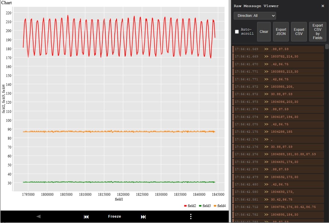 This guide covers three key features available when pfodWeb is displaying a chart: the Freeze controls, the Raw Message viewer, and the Chart Configuration panel.