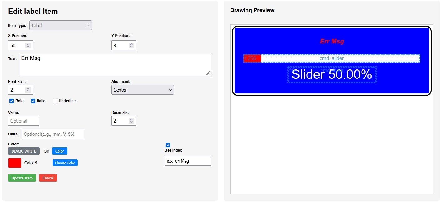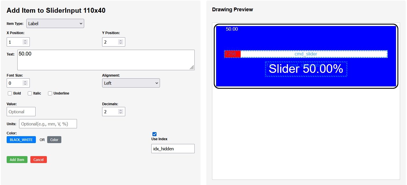 dwgsPtr->label().idx(idx_sliderLabel).color(dwgsPtr->WHITE).text("Slider ").fontSize(8).offset(50,28.5).center().units("%").decimals(2).value(getPosition()).send();