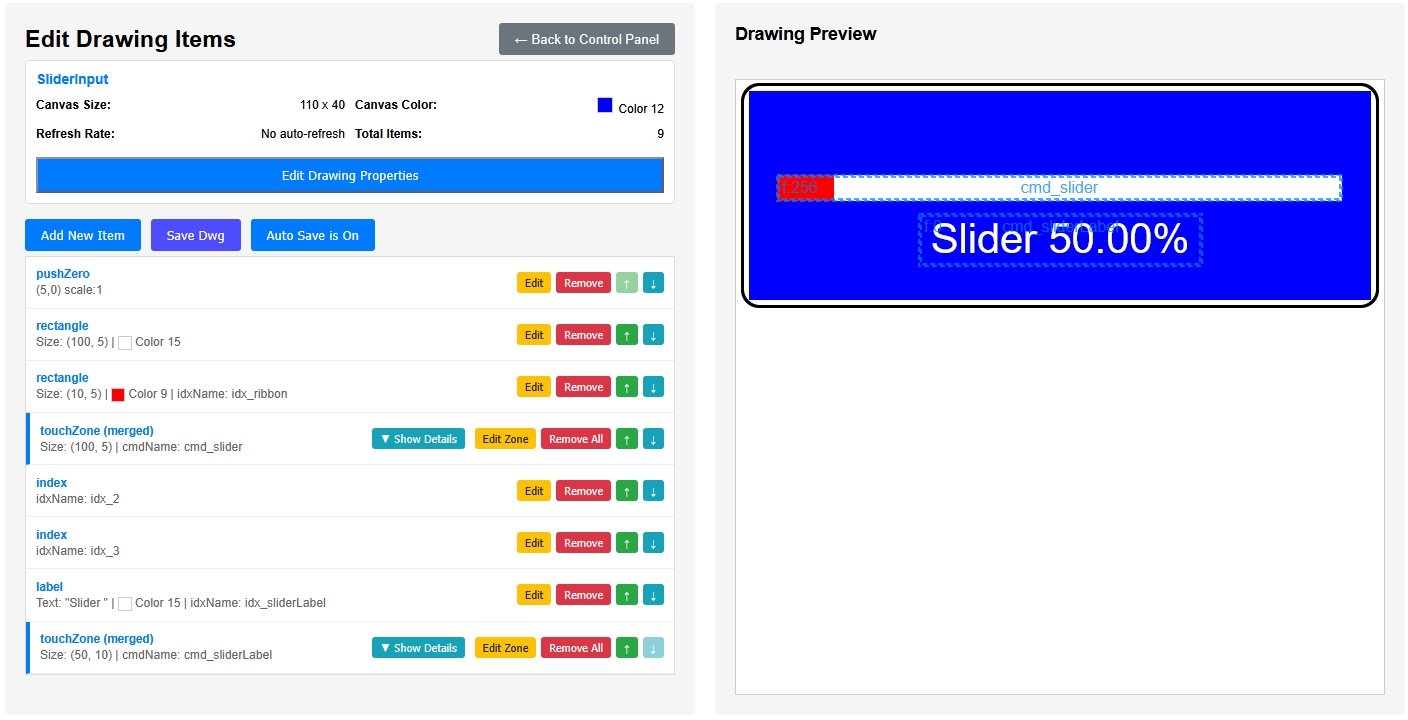 To collect the user's slider settings, edit the processDwgCmds() checks for the command contained in the cmd_slider variable which is the command sent by the slider touchZone and as in the previous tutorial, the position is set to the touchedCol. The command contained in the variable cmd_input is the command sent by the Slider .. % label touchZone after the touchActionInput dialog box has been OKed.