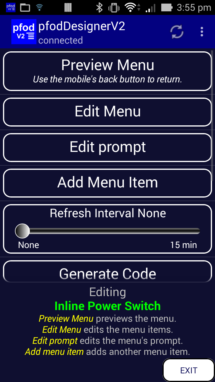By default, pfodApp only requests the menu when you open it or send a command. However sometimes you what the menu to refresh at a regular interval in order to display any status changes on the remote pfodDevice. In the case of the Inline Power Switch, the generated sketch is going to be modified to add a manual push button input to turn the power on and off from the device. So in order to display this local manual override on the remote pfodApp, pfodApp needs to regularly re-request the menu to display the current setting, On or Off.