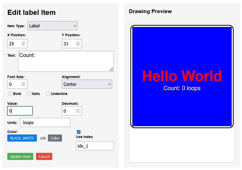 extern size_t loopCounter; void Dwg_HelloWorldCounter::sendIndexedItems() { dwgsPtr->label().idx(idx_1).color(dwgsPtr->BLACK_WHITE).text("Count: ").offset(25,31).center().units(" loops").decimals(0).value(loopCounter).send(); }