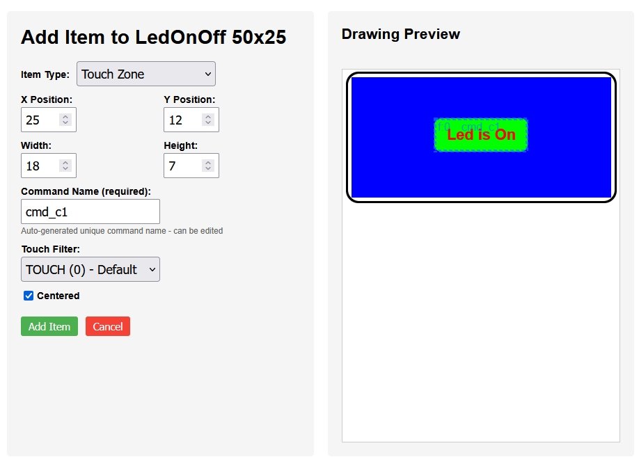 The easiest way to create the update code is to edit the drawing items to the colour and text you want for led off versus on and then generate the new drawing files.