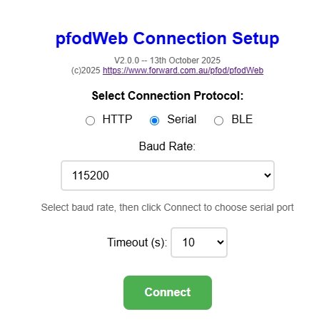 To connect via Serial from pfodWeb, use a recent version of a Chrome or Edge or Opera browser. You also need to enable use of Serial Ports (ask AI if you have trouble)
