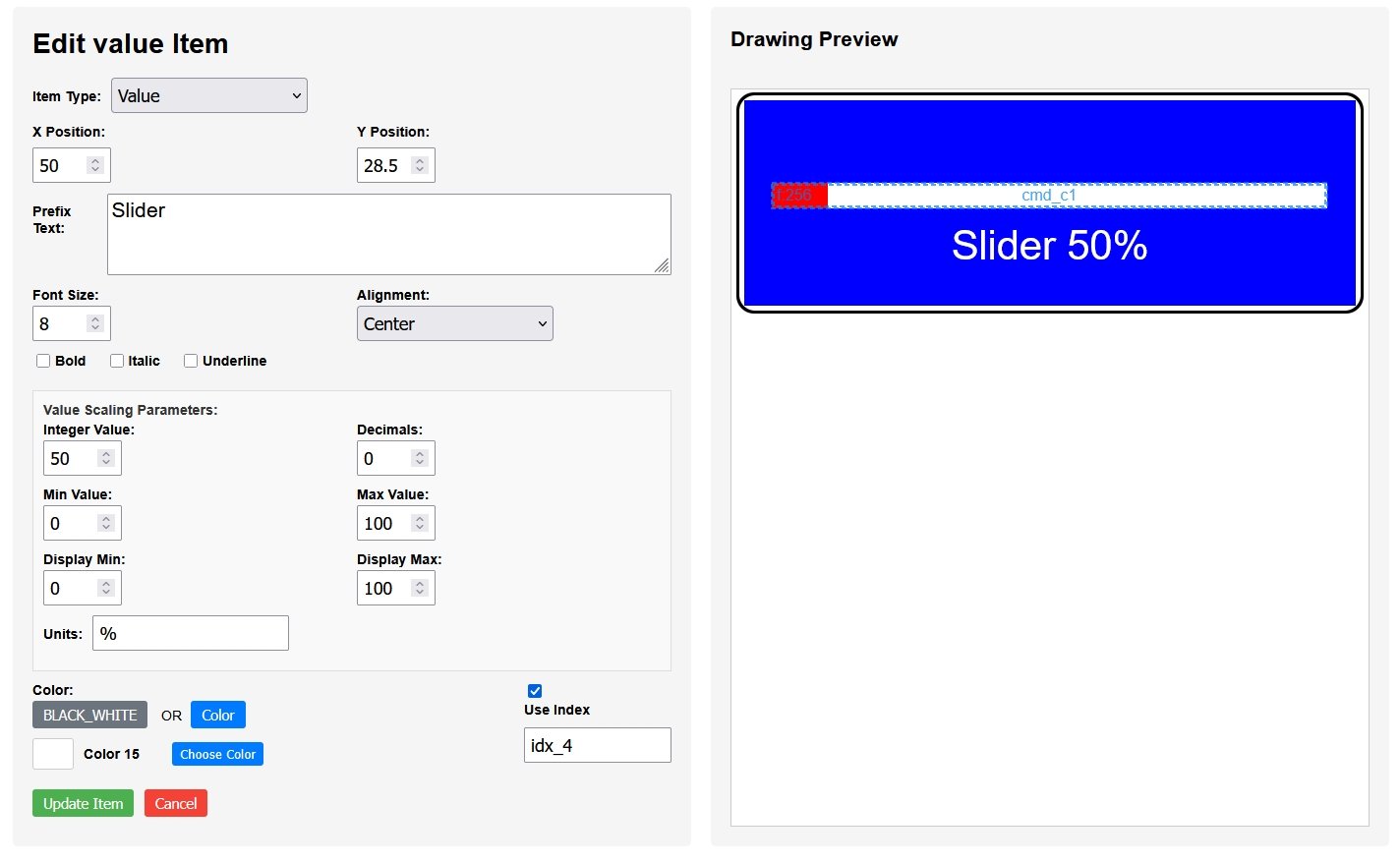 dwgsPtr->label().idx(idx_4).color(dwgsPtr->WHITE).text("Slider ").fontSize(8).offset(50,28.5).center().intValue(getPosition()).units("%").maxValue(100).minValue(0).displayMax(100).displayMin(0).decimals(0).send();