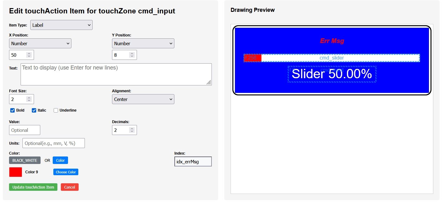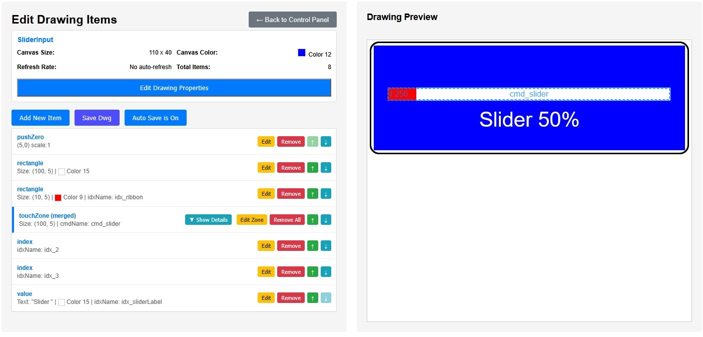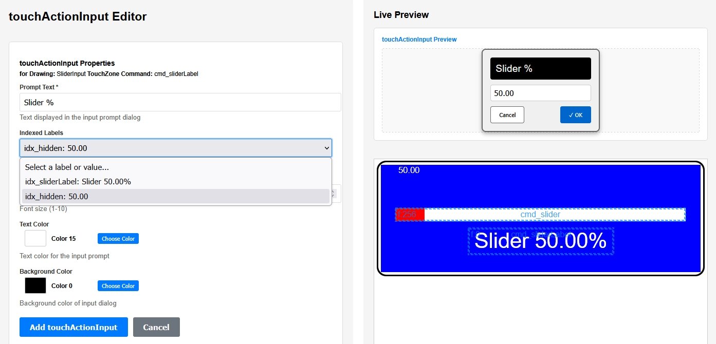 To collect the user's slider settings, edit the processDwgCmds() checks for the command contained in the cmd_slider variable which is the command sent by the slider touchZone and as in the previous tutorial, the position is set to the touchedCol. The command contained in the variable cmd_input is the command sent by the Slider .. % label touchZone after the touchActionInput dialog box has been OKed.